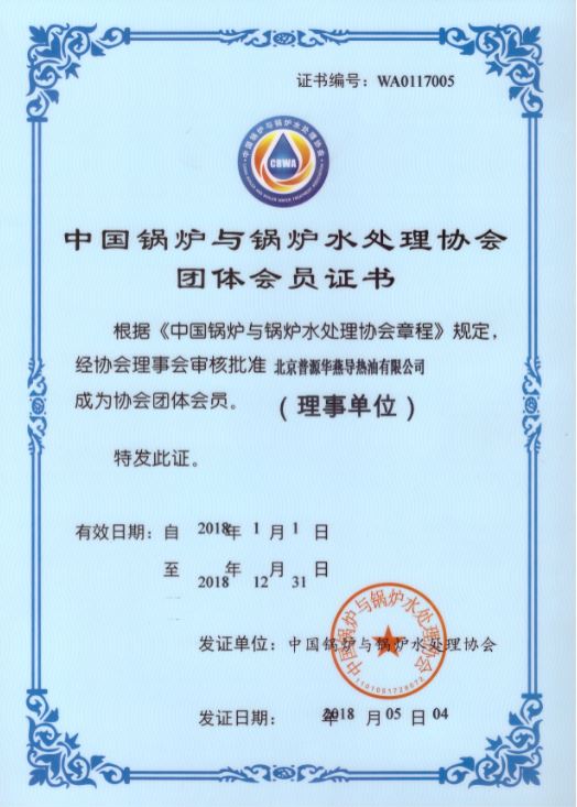 2017年2月22日,北京普源华燕导热油有限公司经中国锅炉水处理协会理事会审核比准,成为中国锅炉水处理协会团体会员理事单位。
